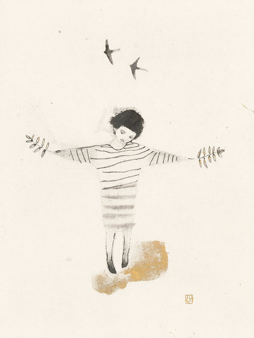 A child playfully balances beneath swallows in joyful flight