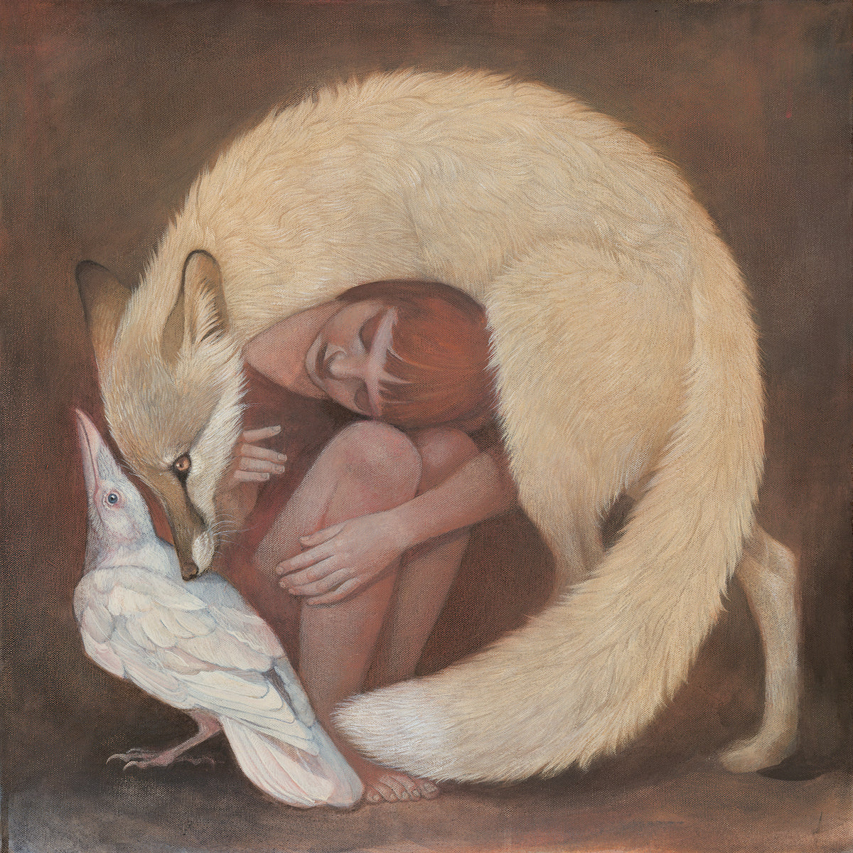 Kindred spirits huddle together in a calming portrayal of kinship and care. The fox and raven keep a watchful eye that adds to the sense of love and protection.