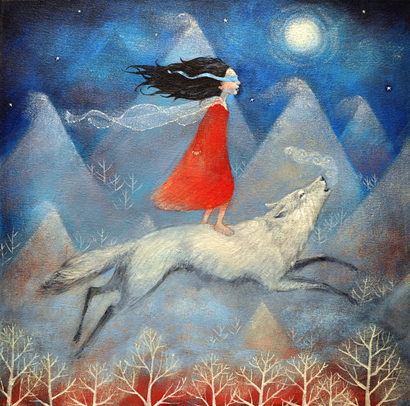 A blindfolded woman rides a white wolf by the light of the wintery moon.