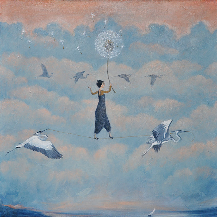 The herons carry this balancing girl with ease. She almost floats, with the help of the fairy clock (this is what we called Dandelion clocks as children!), a device for spreading our hopes, dreams and wishes to the wind. Far below a small sailing yacht also experiences the ease of 'flying' over the water's surface.