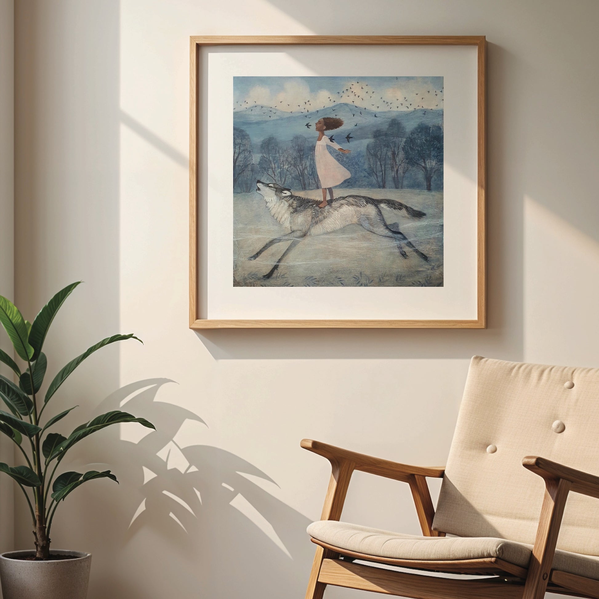 I wanted to capture the bracing energy of a cold autumnal morning, and the sheer joy of starlings’ murmurations, that cannot help but uplift a soul. The child is facing the oncoming winter with courage and trust in herself, and with an open heart and open throat, sings her love for the world as she flies…