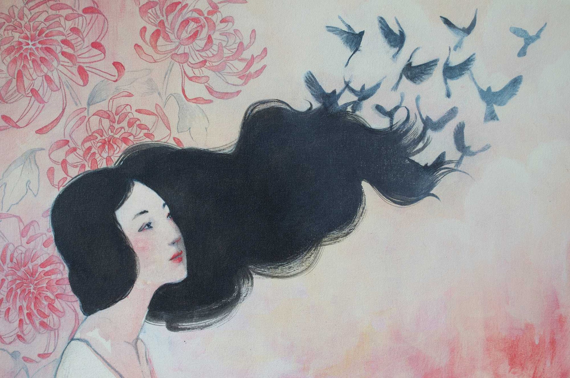 A Japanese woman stands by red flowers as birds fly from her dark hair.