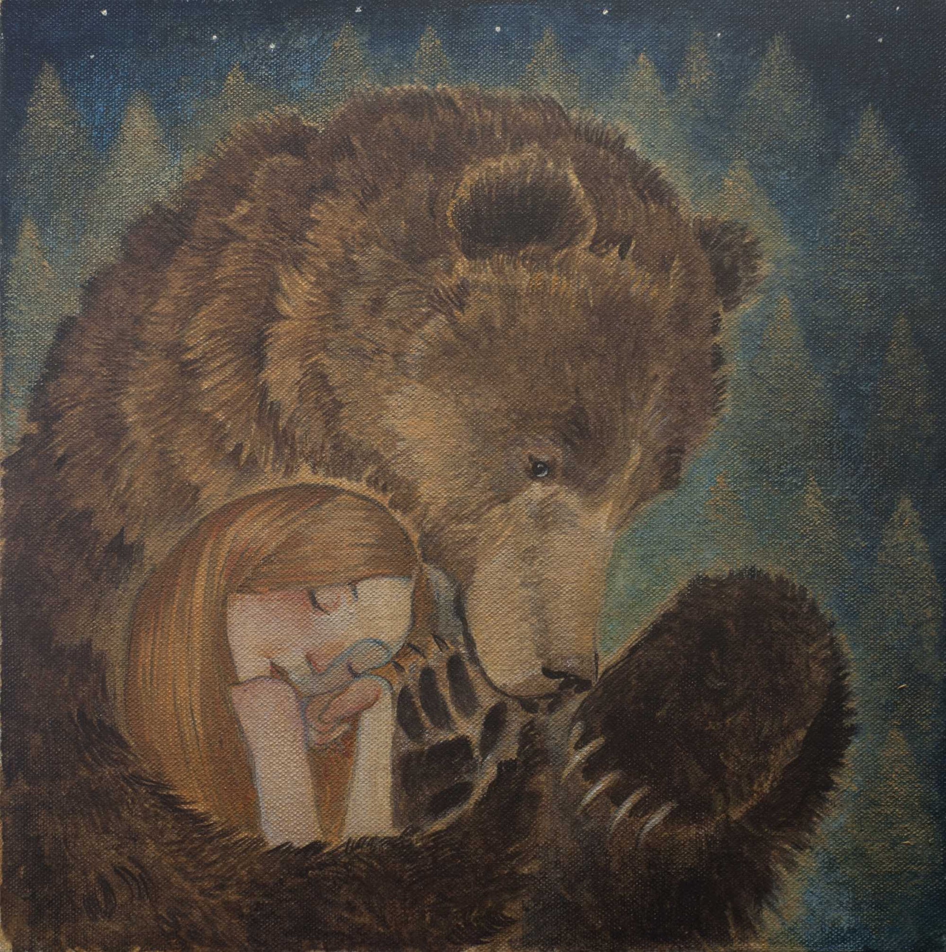 Bear gently cradles long-haired girl